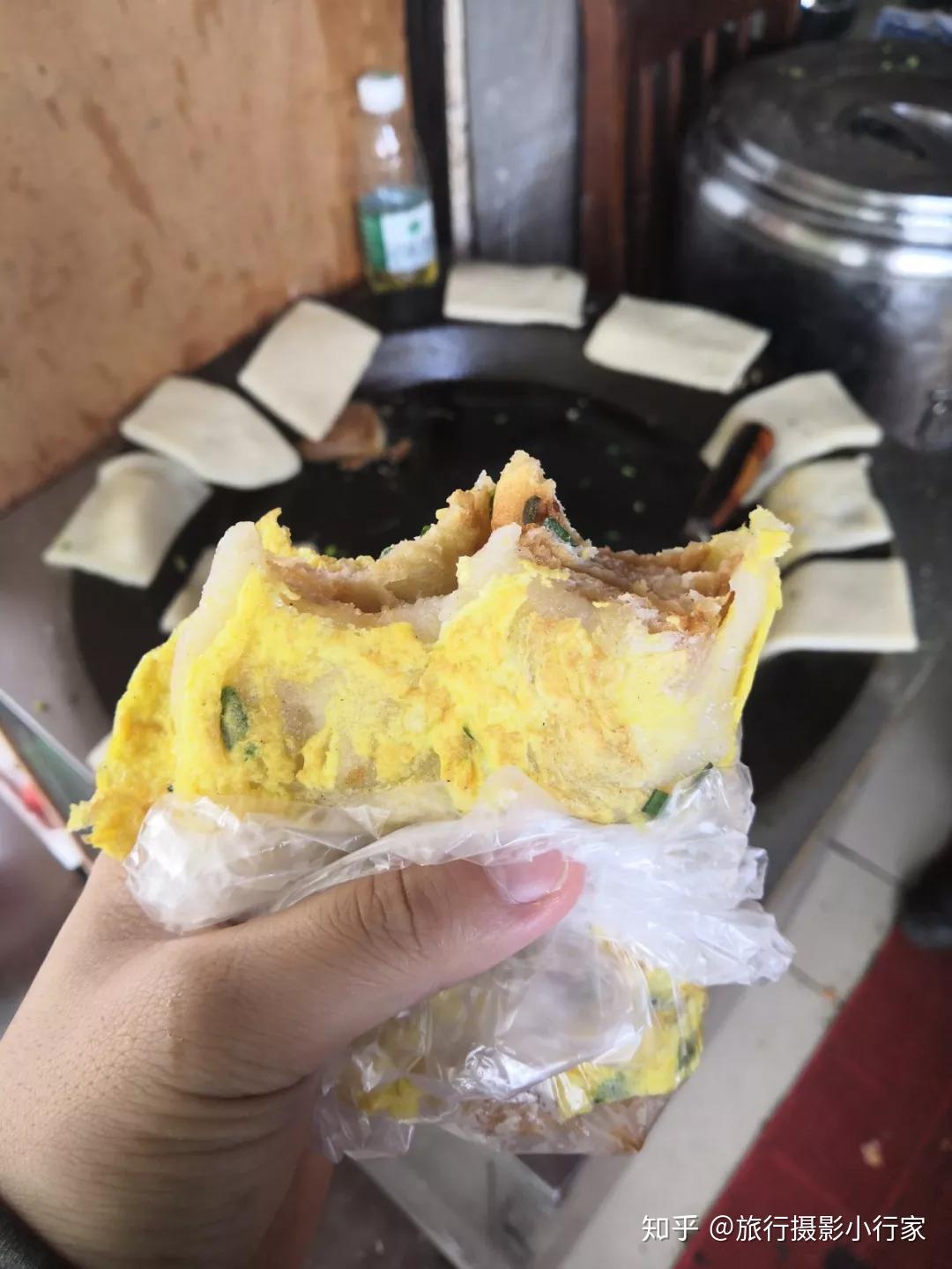 咬一口麻糍块是记忆中的味道,最外层的鸡蛋和葱花煎颜色鲜艳,传出阵阵香味,一口咬下去,里面的麻糍软软的,再里层的油条酥酥的
